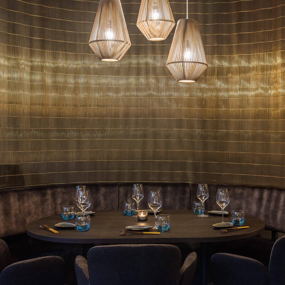 trenzadas artesanalmente en una estructura metálica, tamizan la luz produciendo efectos singulares.